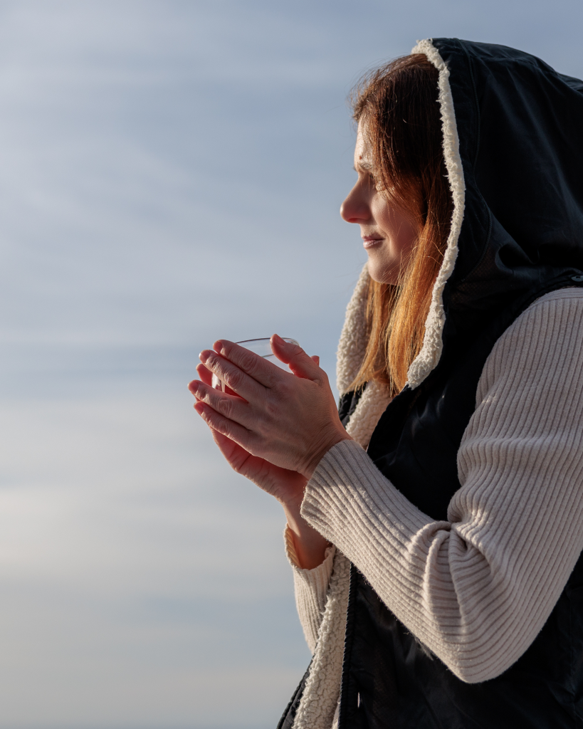 Schon 20 Minuten Aufenthalt im Wald können Stresshormone erheblich reduzieren. In der kalten Luft nimmst du deinen Körper viel bewusster wahr. Dieses „Eintauchen“ hilft dir, die Rolle der Funktionierenden abzulegen und in einen Zustand der Achtsamkeit zu gleiten, in dem echte, ungestellte Momente entstehen können.